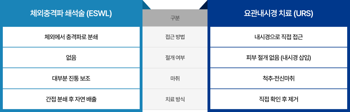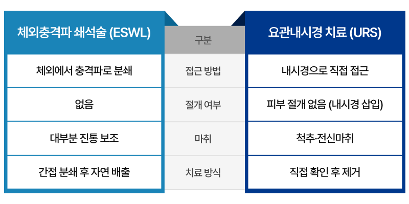 체외충격파와 요관내시경은 접근 방식과 치료 결과에서 차이가 있습니다.